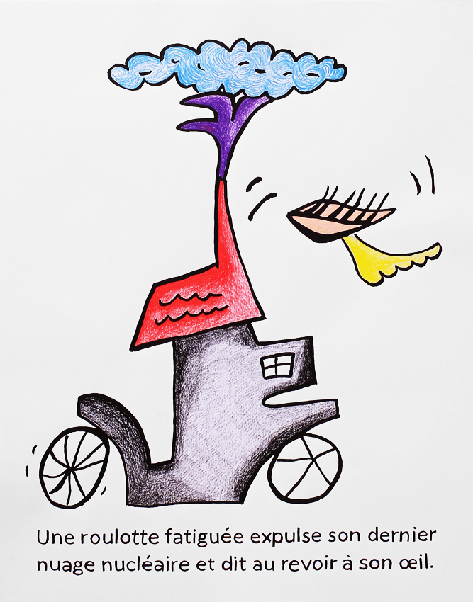 Tous les dessins sous-titrés, encre de Chine, feutre Posca, craie aquarellable, 65 x 50 cm, 2022 |